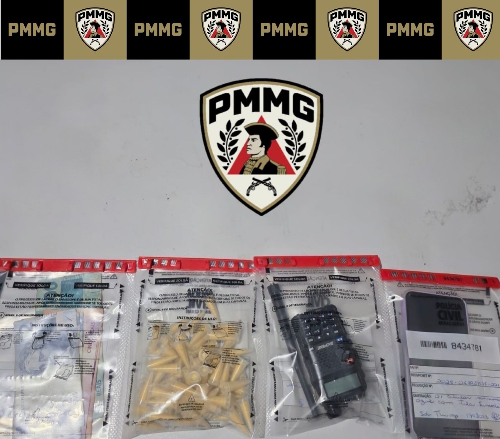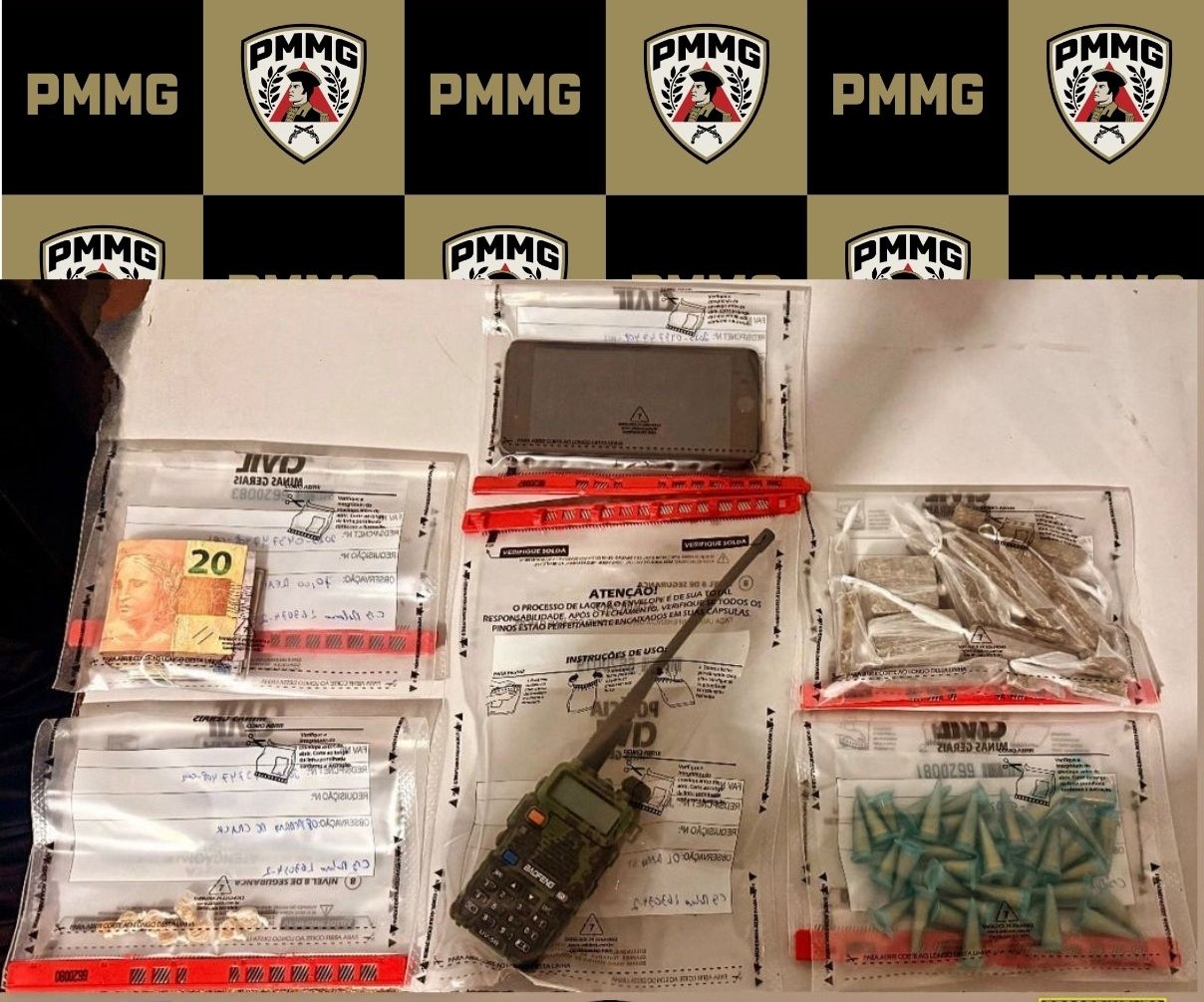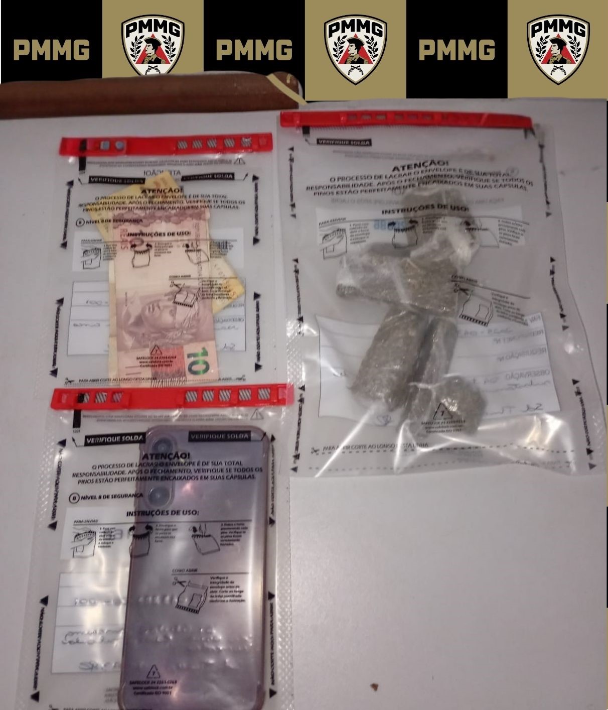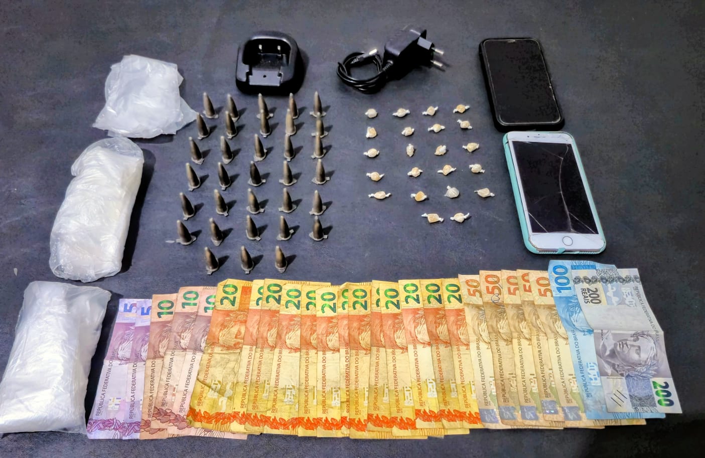 Dois adolescentes, de 14 e 15 anos, foram flagrados escondendo entorpecentes em um pasto próximo. Os militares localizaram 33 pinos de cocaína e 22 pedras de crack, além de celulares, rádios comunicadores, materiais para embalagem e dinheiro.