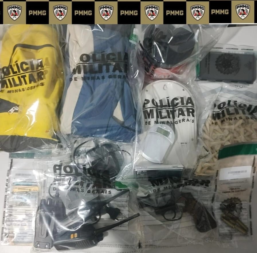 A motocicleta utilizada estava clonada e possuía registro de furto/roubo. Na residência do suspeito, a PM encontrou um revólver calibre .38 municiado, rádios comunicadores, coletes balísticos, roupas usadas em crime anterior, drogas embaladas para comércio e dinheiro.