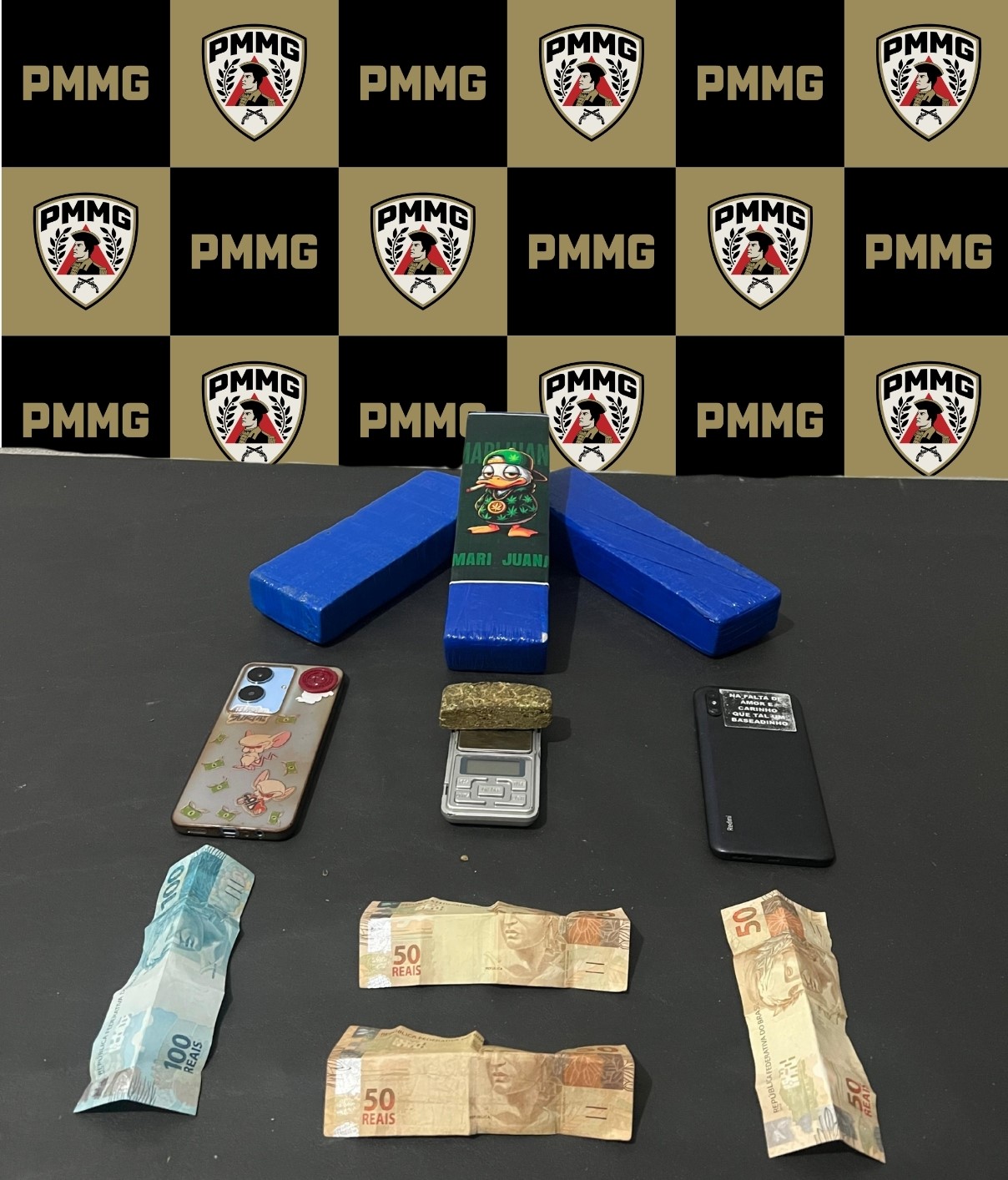 Em buscas na residência do suspeito, com autorização dos familiares, foram localizadas três barras de maconha escondidas em um travesseiro, uma balança de precisão e celulares usados no tráfico.