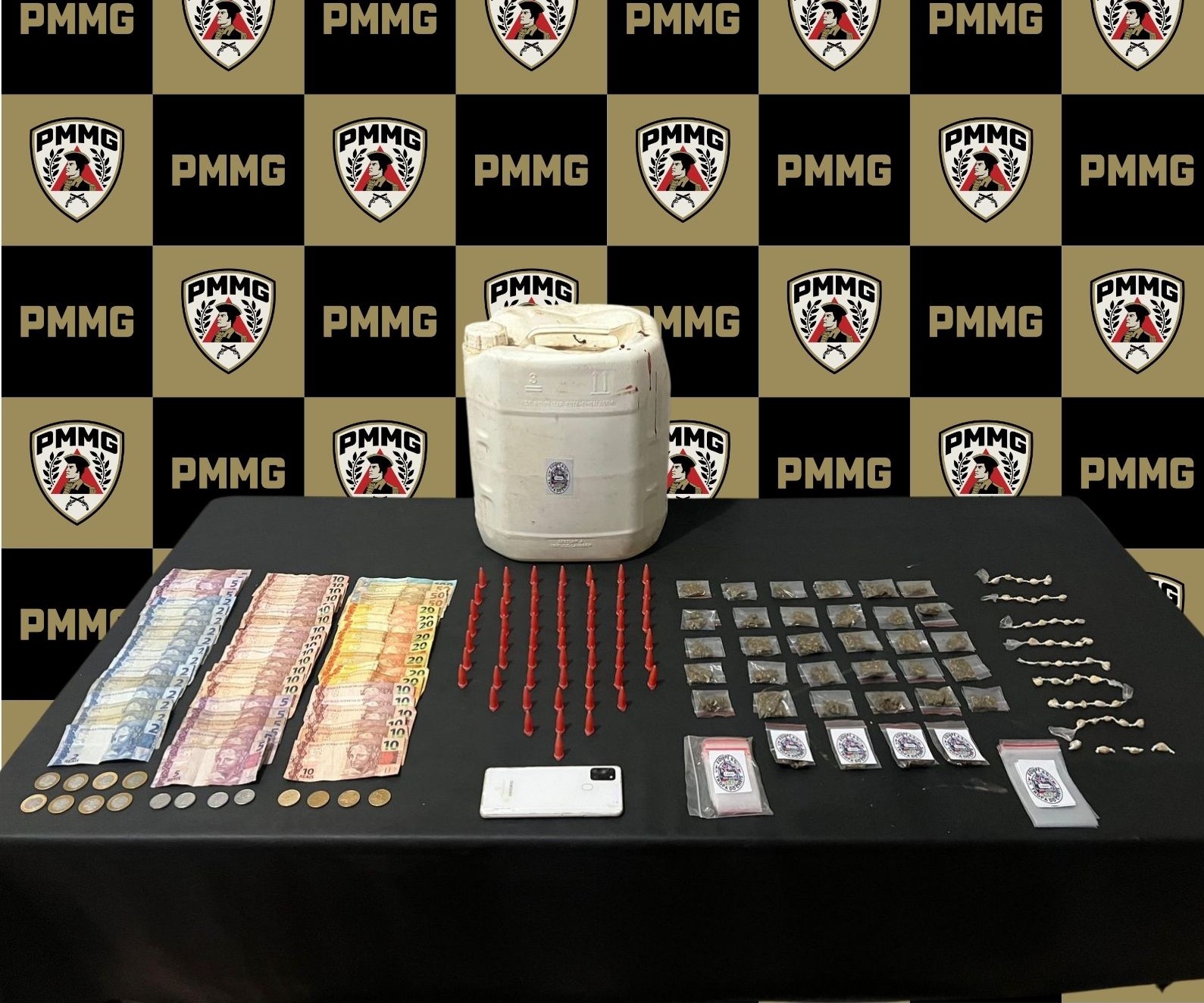 Após denúncias que indicavam o homem de 34 anos como chefe do tráfico na cidade, os militares iniciaram monitoramento de sua residência. Uma mulher de 43 anos foi flagrada saindo do local com uma mochila contendo 28 buchas de maconha. Na casa do suspeito, os policiais encontraram um pote com mais drogas, 48 pinos de cocaína, um papelote da substância, porções de maconha e dinheiro escondido em roupas íntimas da companheira, de 20 anos. Também foram apreendidos três celulares e uma motocicleta Honda XRE 300, usada no transporte de entorpecentes.