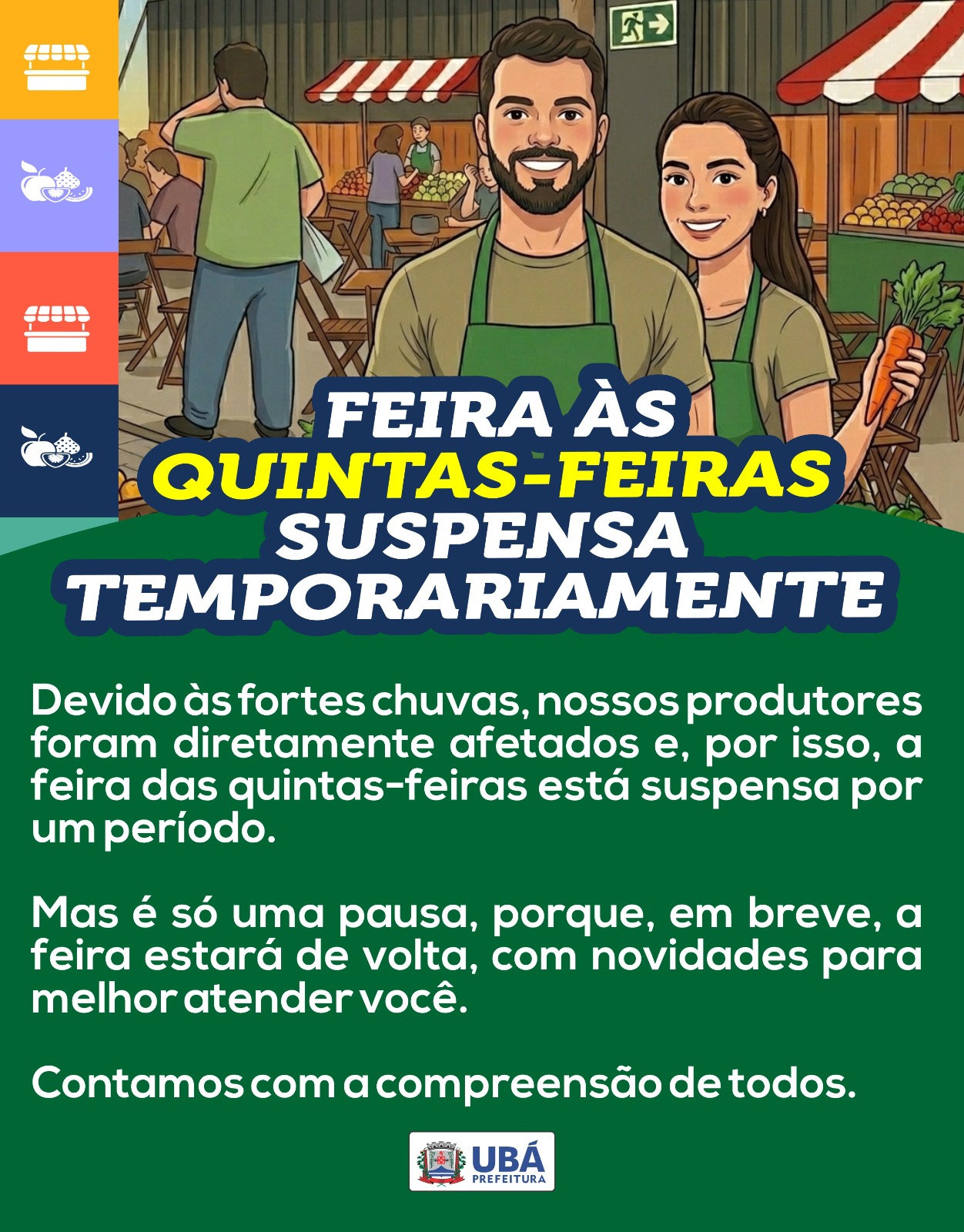 Apoio ao Produtor Local A feira de quinta-feira é um importante espaço de comercialização e convivência em Ubá, reunindo produtores locais e consumidores. Por isso, a suspensão é considerada uma ação provisória para que o setor se recupere dos danos climáticos.