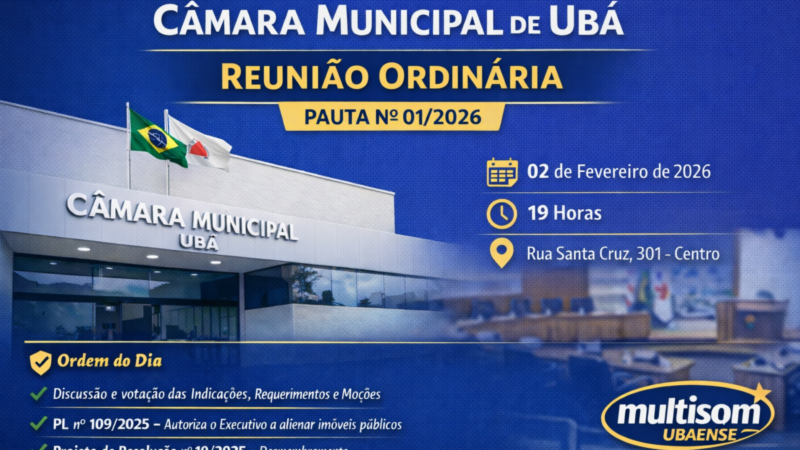 A Câmara Municipal de Ubá realizará nesta segunda-feira, 27 de outubro de 2025, às 19h, a sua 44ª Reunião Ordinária, em sua sede localizada à Rua Santa Cruz, nº 301, Centro. A convocação é feita pelo presidente vereador José Maria Fernandes, com base no Artigo 54, inciso II, da Lei Orgânica Municipal e no Artigo 17, inciso XIV, do Regimento Interno da Casa.